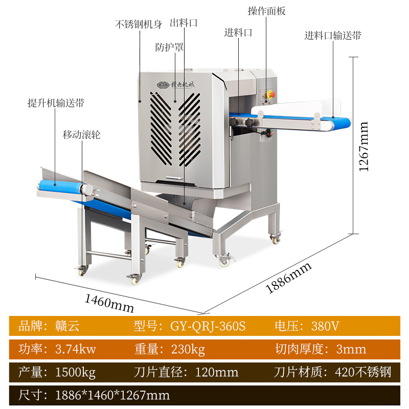 簡介:新(xīn)款輸送帶式(shì)連續切(qiē)肉機,可針(zhēn)對無骨肉類、偏軟性蔬菜(cài)的切片、切絲、切丁的快速加(jiā)工生產(chǎn),機器采用輸送帶式(shì)傳(chuán)輸,減少人工的頻(pín)繁走動,增加工作效率